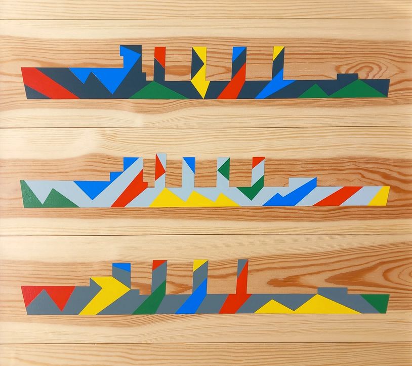 I design and make screenprints, lino prints, constructions, archival pigment prints and bespoke works inspired by Norman Wilkinson's invention of Dazzle Camouflage. In more general terms my work is about the exploration of ideas which correlate colour, shape, space, texture and pattern.